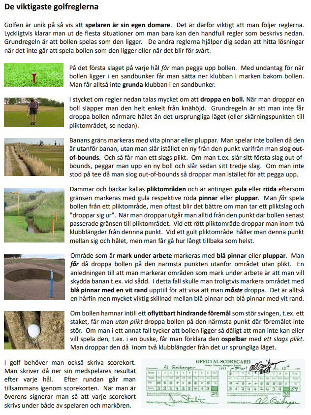 Golfens regelbok har flera hundra sidor och täcker in allt från spelets grundläggande regler till regler om amatörstatus, klubbors utformning, bollars utgångshastighet, etc..  För att göra det enkelt att komma igång och spela har vi här samlat de viktigaste reglerna.