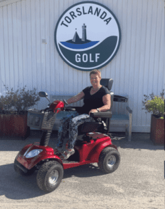 – Hyra av golfscooter Arvid, se bild nedan. Pris: 150kr per runda, 10 runders klippkort för 1.000kr